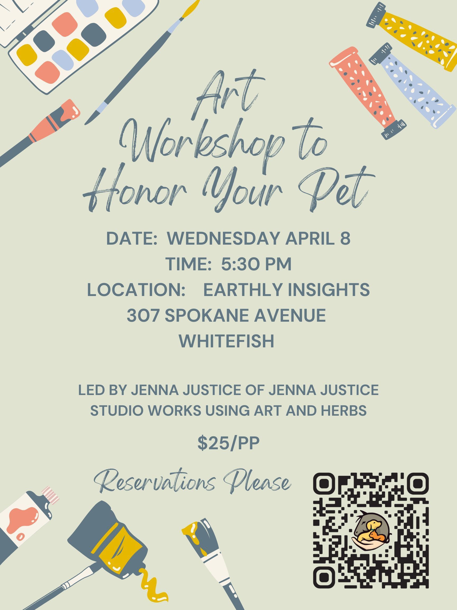 Join Jenna Justice of Jenna Justice Studio Works who will lead you in an artistic expression to honor your pet with canvas and herbs. A keepsake you can take with you and last for years.